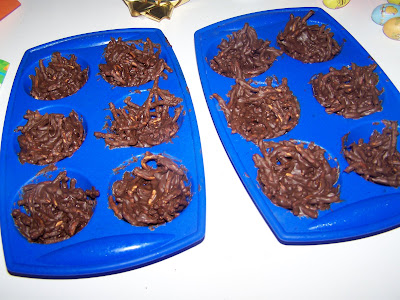 We had a great Easter celebration that included finding Easter baskets, naps, finding Easter eggs and a great meal with our friends. We are blessed to have such a great church home/family and really are excited to watch where God leads this church. We had a great time hanging out with Sue and Steve and their family on Easter. The kids had a blast jumping on their trampoline and finding eggs while we all enjoyed some adult conversation, great food and great company. What a blessed Easter. I took over the bird's nest's that I had made and everyone seemed to really like them. I really liked them too, they tasted so yummy and were easy to make!